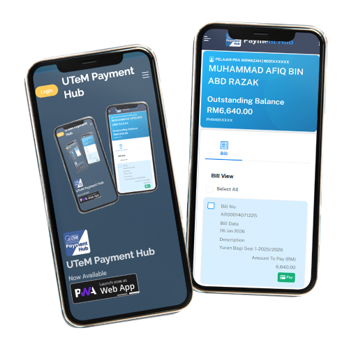 UTeM Payment Hub is the official digital payment platform of Universiti Teknikal Malaysia Melaka (UTeM), designed to make financial transactions easy and efficient for everyone. Whether you're a student, staff, or public user, our platform ensures a secure, fast, and convenient way to manage all your payments.